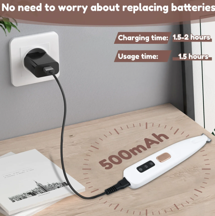 Powered by a 500mAh rechargeable battery, this cordless trimmer is lightweight and portable—perfect for home use or travel. It fully charges in about 1.5 hours and can even be used while charging.